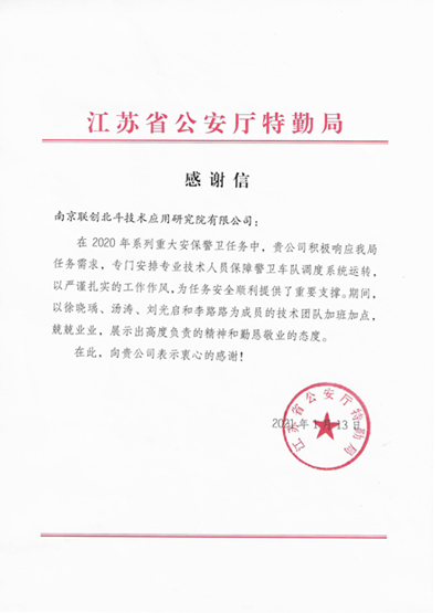 省公安厅特勤局发来感谢信,对联创北斗研究院在重大安保警卫任务中的突出表现和应用的优异成绩表达肯定和谢意。这是对联创北斗研究院技术素养、业务素养、职业素养的高度认可,更为研究院全员带来了强有力的信心,激励着大家朝更高峰攀登。