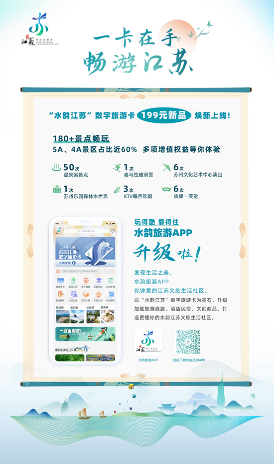 在新品上线期间,更为广大市民和游客带来了丰厚增值权益。同时以“水韵江苏”数字旅游卡为基石,全新升级的“水韵旅游”APP加载了旅游线路、酒店民宿、江苏味道、文创非遗等,打造水韵江苏文旅生活社区,用数字人民币或信用卡补贴还能享受更多优惠,吸引更多的人用“说走就走的旅行”感受水韵江苏的美好。