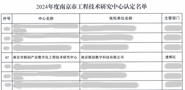 近日,南京市科学技术局公布了《2024年度南京市工程技术研究中心认定名单》。由南京联创数字科技有限公司建设的“南京市联创产业数字化工程技术研究中心”成功入选!