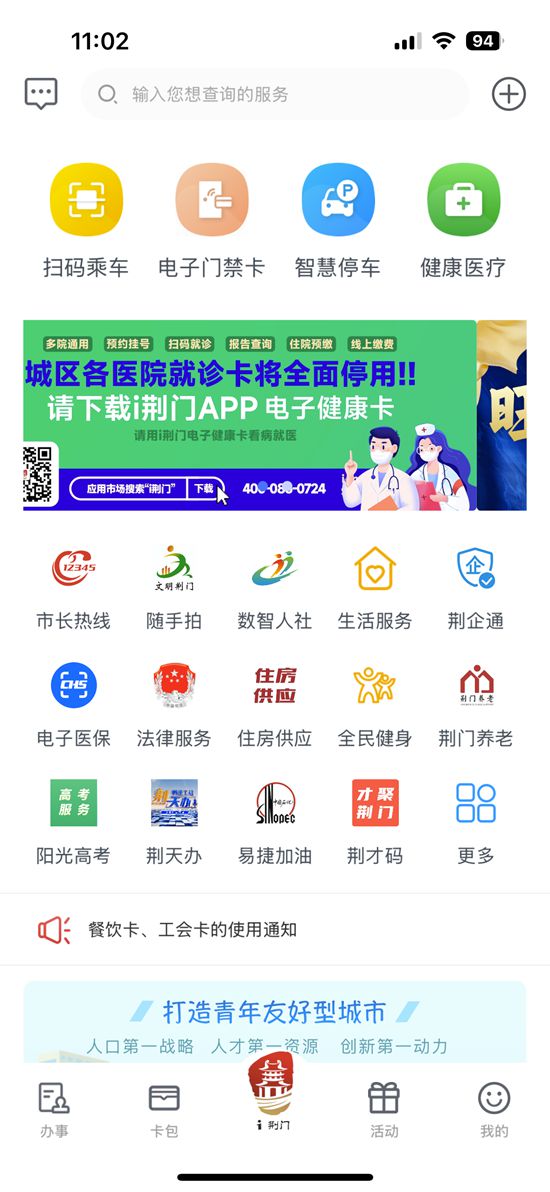 “i荆门”平台是由南京联创数字科技有限公司与荆门市民卡有限公司联合打造的城市数字平台。平台以市民卡(码)为核心,秉持“一码通全城,一卡惠民生”数据驱动的发展理念,致力于在荆门建设一个以“便民、利民、惠民”为宗旨,集社保、交通出行、养老、文化、体育、旅游、教育、财政补贴等多功能于一体的数字城市综合服务平台,构建一个线下“实体市民卡”和线上“数字市民码”互通互用、一卡多用、一卡通用、一卡通城、一码扫全城的城市数字平台。