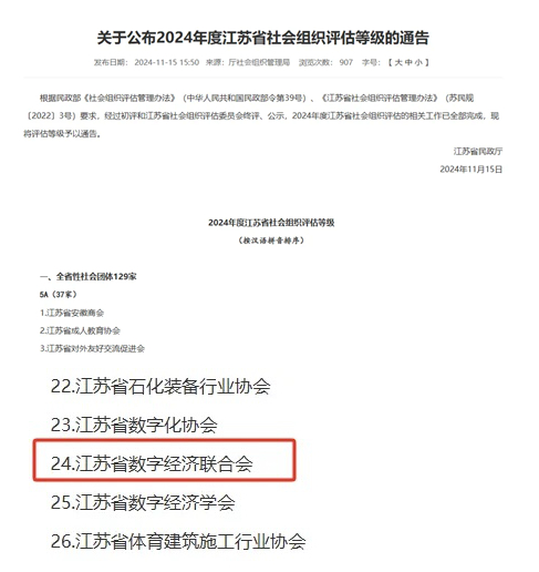 近日,江苏省民政厅向社会公布了2024年度江苏省社会组织评估等级结果,江苏省数字经济联合会荣获社会组织最高等级“5A级社会组织”称号。
