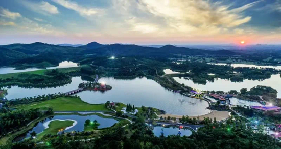 西面则是生态休闲区:四五个小型湖泊,错落有致地点缀在山林之间,与不远处波光粼粼的银杏湖相映成趣,中间又用绿道、廊桥连为一体,打造了千年银杏林、天鹅湖、四季花园、双桥爱情岛、音乐喷泉等多处景观。