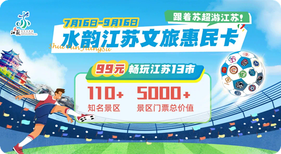 现在“苏超”比赛激战正酣,好多人追着比赛跑遍全省。为推动文体旅深度融合,江苏水韵文化旅游运营有限公司在江苏省文旅厅指导下创新推出“水韵江苏”文旅惠民卡。即日起至9月16日,市民仅需99元即可购买,畅游全省13个城市的114家热门景区,涵盖周庄、同里等江南古镇,金山、渔洋山等历史名山,以及洪泽湖湿地、黄海森林公园等避暑胜地,5A、4A级景区占比超一半。